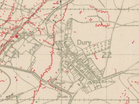 We continued our way through the village of Dury meeting with very little opposition. There were numbers of dead, the victims of our barrage lying about. I found three prisoners huddled in the dark corner of a funk hole who surrendered willingly and hustled away to the rear. Various prisoners, some of them officers of rank, were found in cellars and elsewhere in the village.