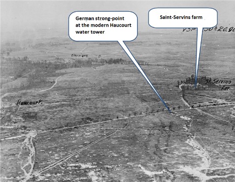There was a German post, directly in front of the 50th Battalion. There was also a much larger German outpost on Kentner’s right, on the other side of St-Servins Farm. It was located on the high ground at Haucourt, near the modern water tower on the Arras-Cambrai road. This outpost had been holding out since the beginning of the Battle for Vis-en-Artois. Already surrounded by September 2nd, the outpost was finally captured by soldiers of the 85th Canadian Battalion (12th Brigade, 4th Canadian Division) on the morning of September 2nd. I don’t think anyone would doubt the bravery of the Germans holding this outpost. Kentner describes what happened: