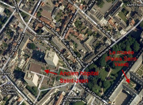 We know that, at the time, the British Army had a hospital set up in the civilian hospital Saint-Jean, which was located on the rue Saint-Aubert near the intersection with the rue des Agaches. Unfortunately, this hospital has been demolished since the Second World War, so the neighborhood is unrecognizable today. The old Saint-Jean hospital has been replaced by two American-style towers and a new road, the rue Pierre-Bérégovoy, crosses the old hospital complex. (The rue Bérégovoy starts at the park in front of the palace of Saint-Vaast, cuts the old hospital complex by a third and reaches the rue Saint-Maurice by an overpass.)